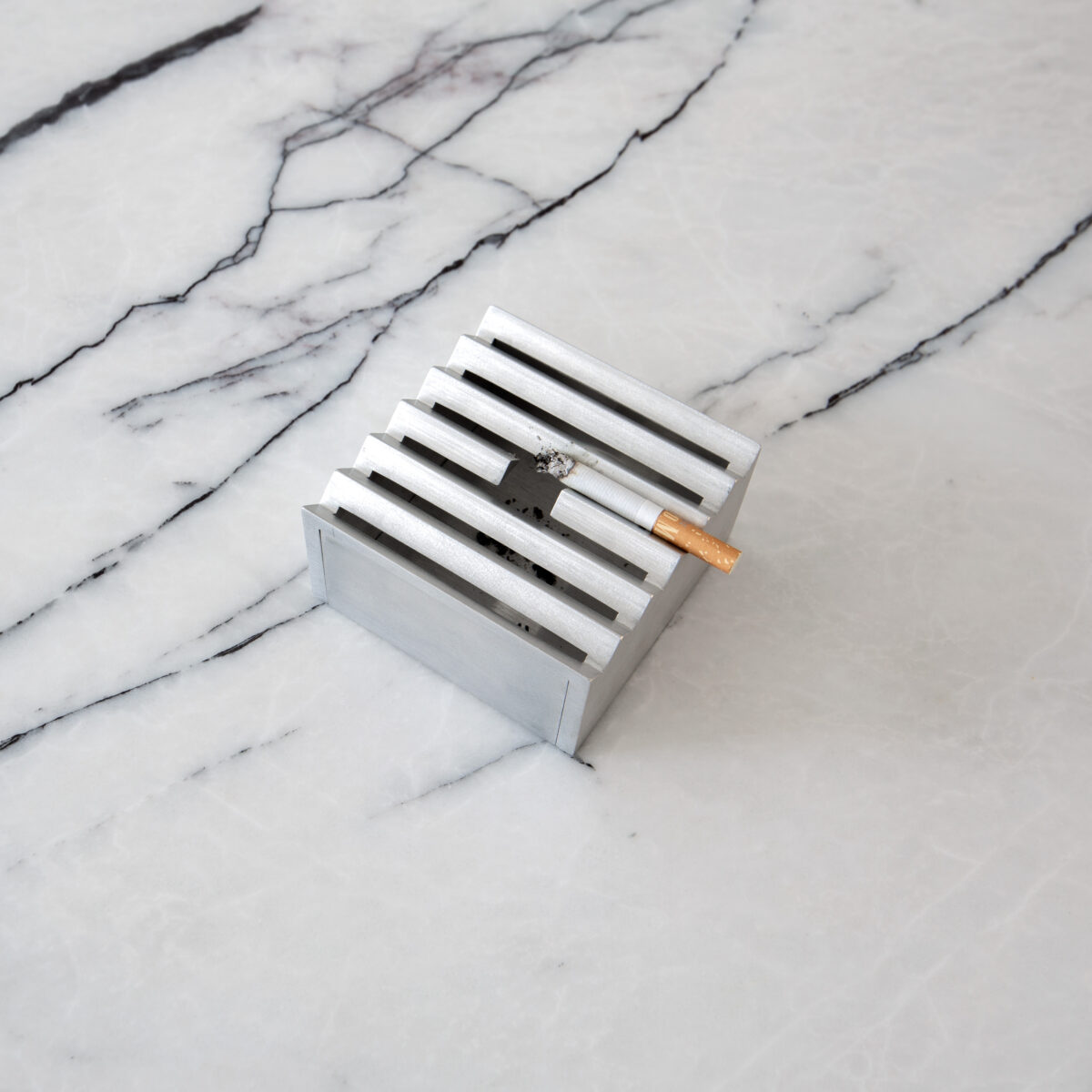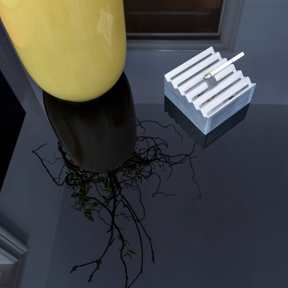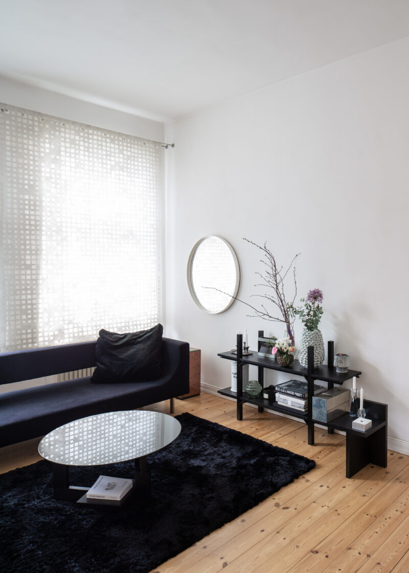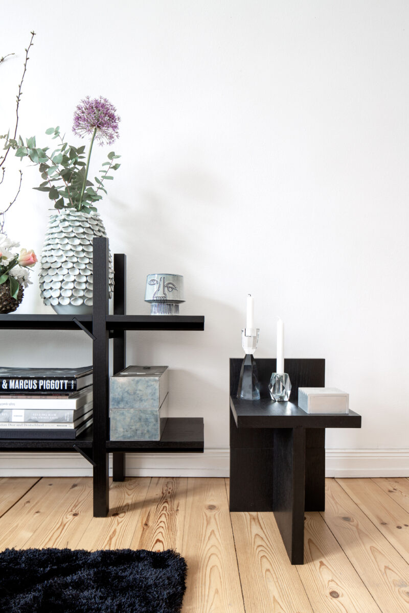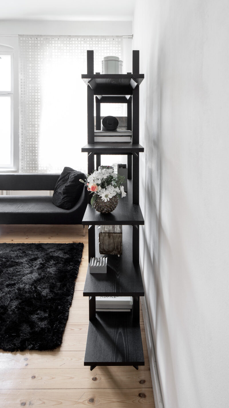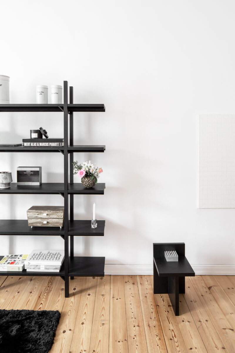 DADO Shelves, a DOVETAIL Side Table, a DOVETAIL Leaner, a IHCUGON Table, and an U-PROFILE Aluminum Ashtray find new context. Their forms and materials, designed with a specific architectural language, engage in dialogue with the apartment’s existing character.