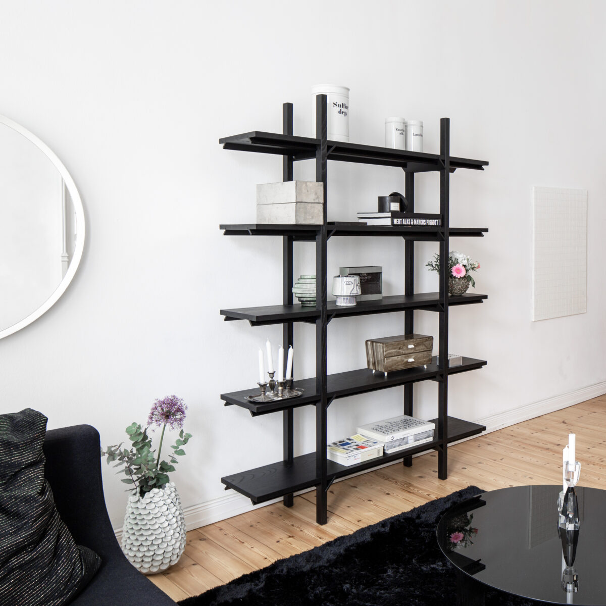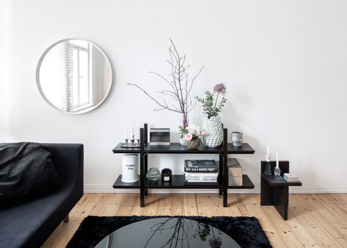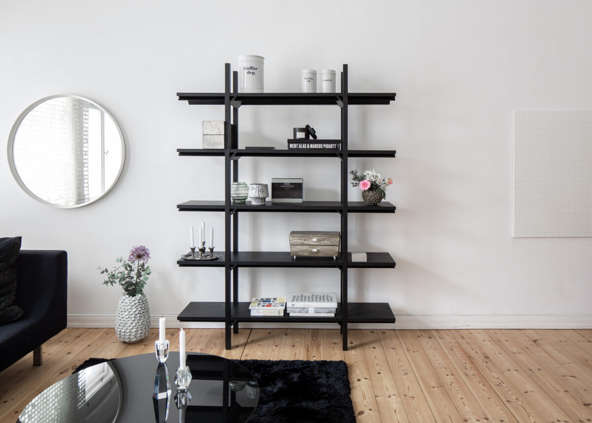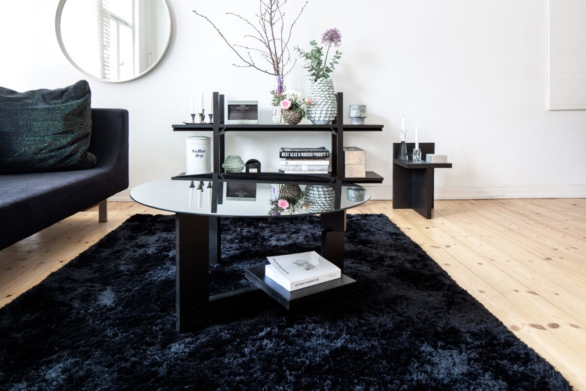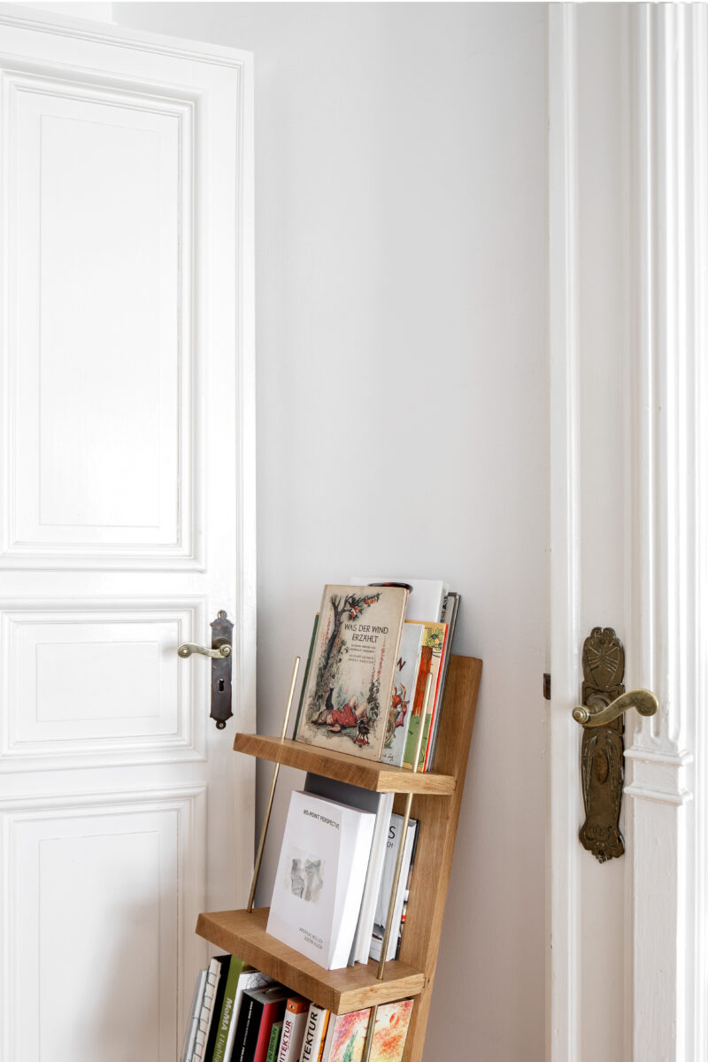 DADO Shelves, a DOVETAIL Side Table, a DOVETAIL Leaner, a IHCUGON Table, and an U-PROFILE Aluminum Ashtray find new context. Their forms and materials, designed with a specific architectural language, engage in dialogue with the apartment’s existing character.