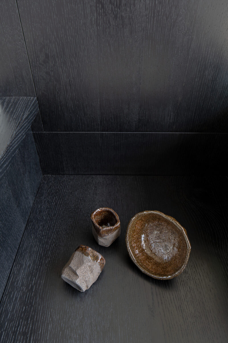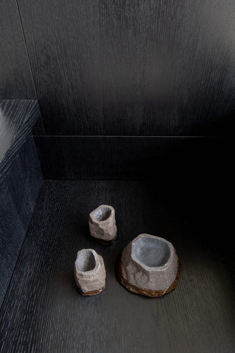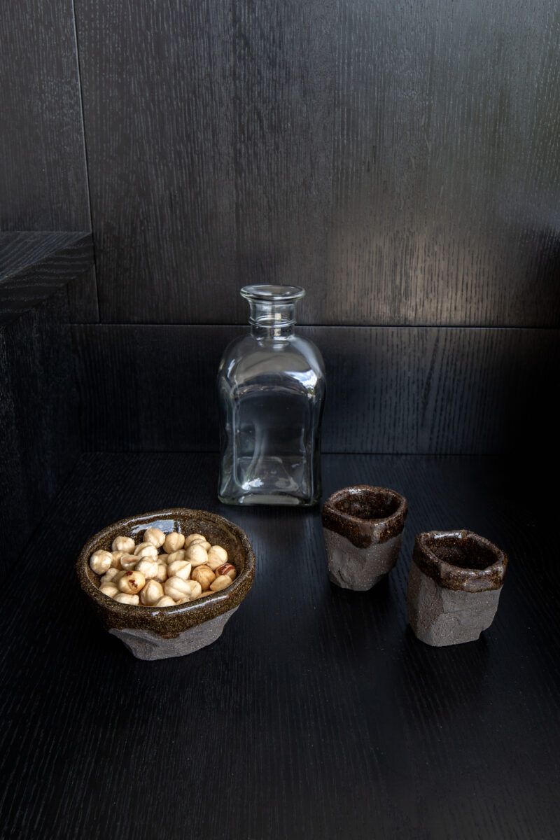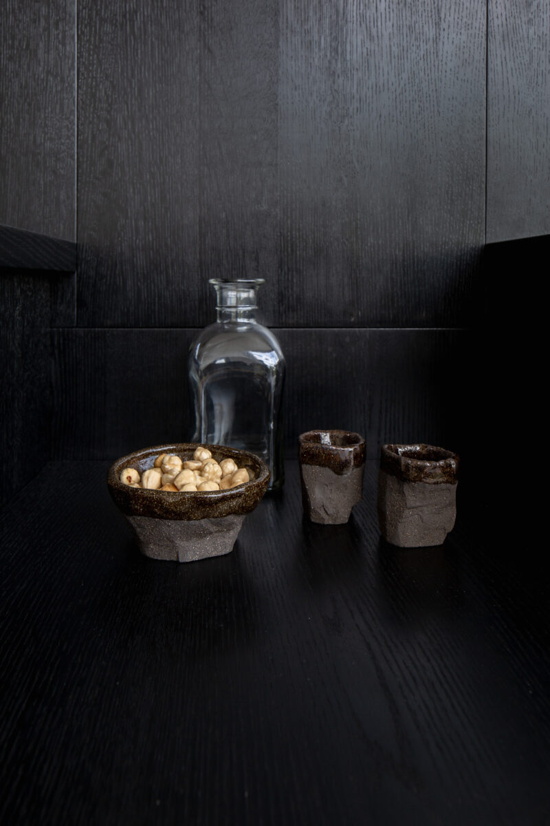 Black earth, molded into two cups and a serving bowl. Glaze on the rim and along the inner surfaces. Robust walls, ready for travel and celebration. Turned upside down, they become miniature volcanoes. A gift to friends I was meeting in Crete for sharing ouzo and olives under the Mediterranean sun.