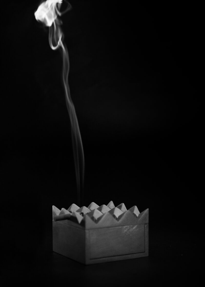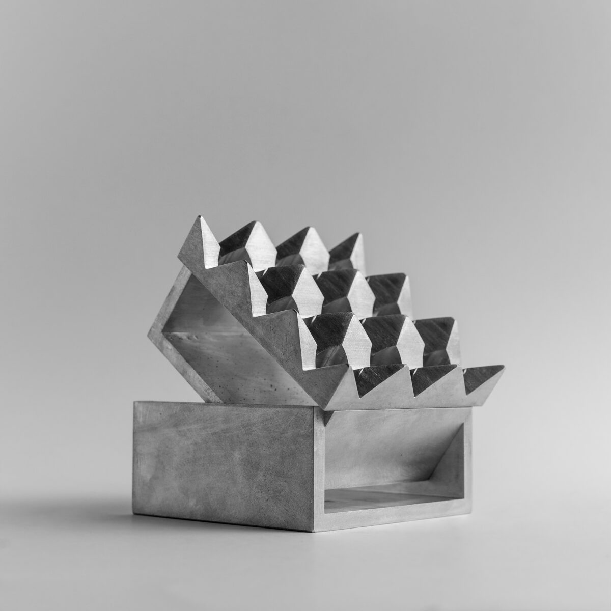 An interplay between form and function inspired this ashtray. Extruded aluminum, with its inherent industrial vocabulary, is minimally reformed. A machined V-form creates an unexpected, almost architectural aesthetic. The resulting halves interlock through friction alone – a testament to aluminum’s precision and expressive potential.