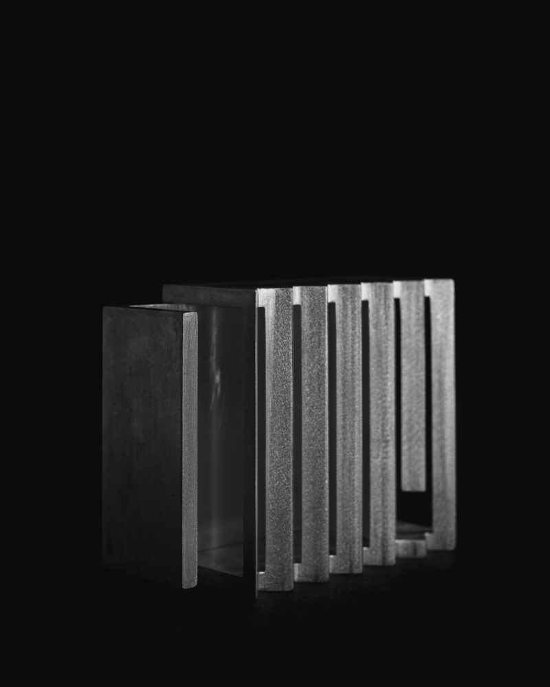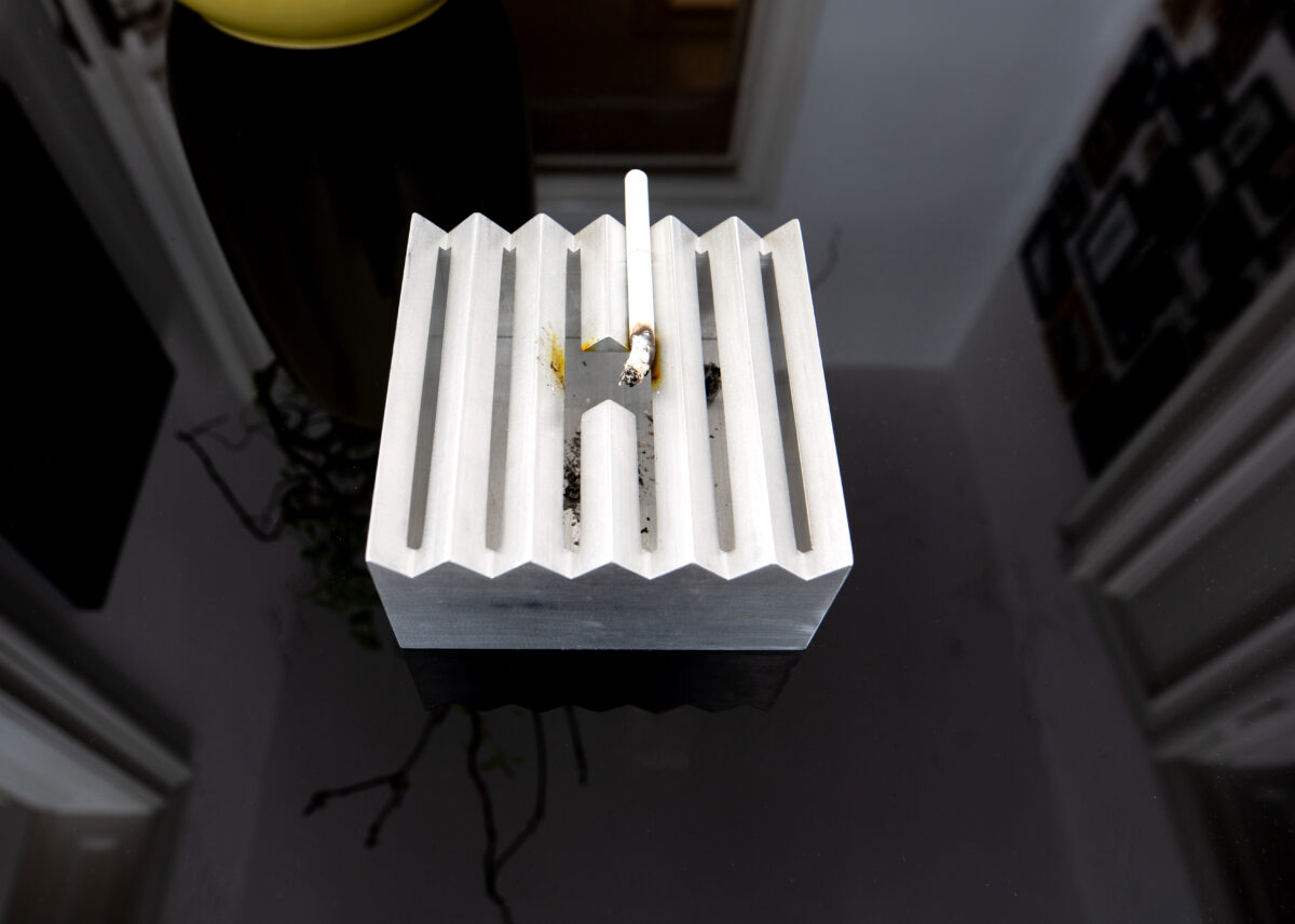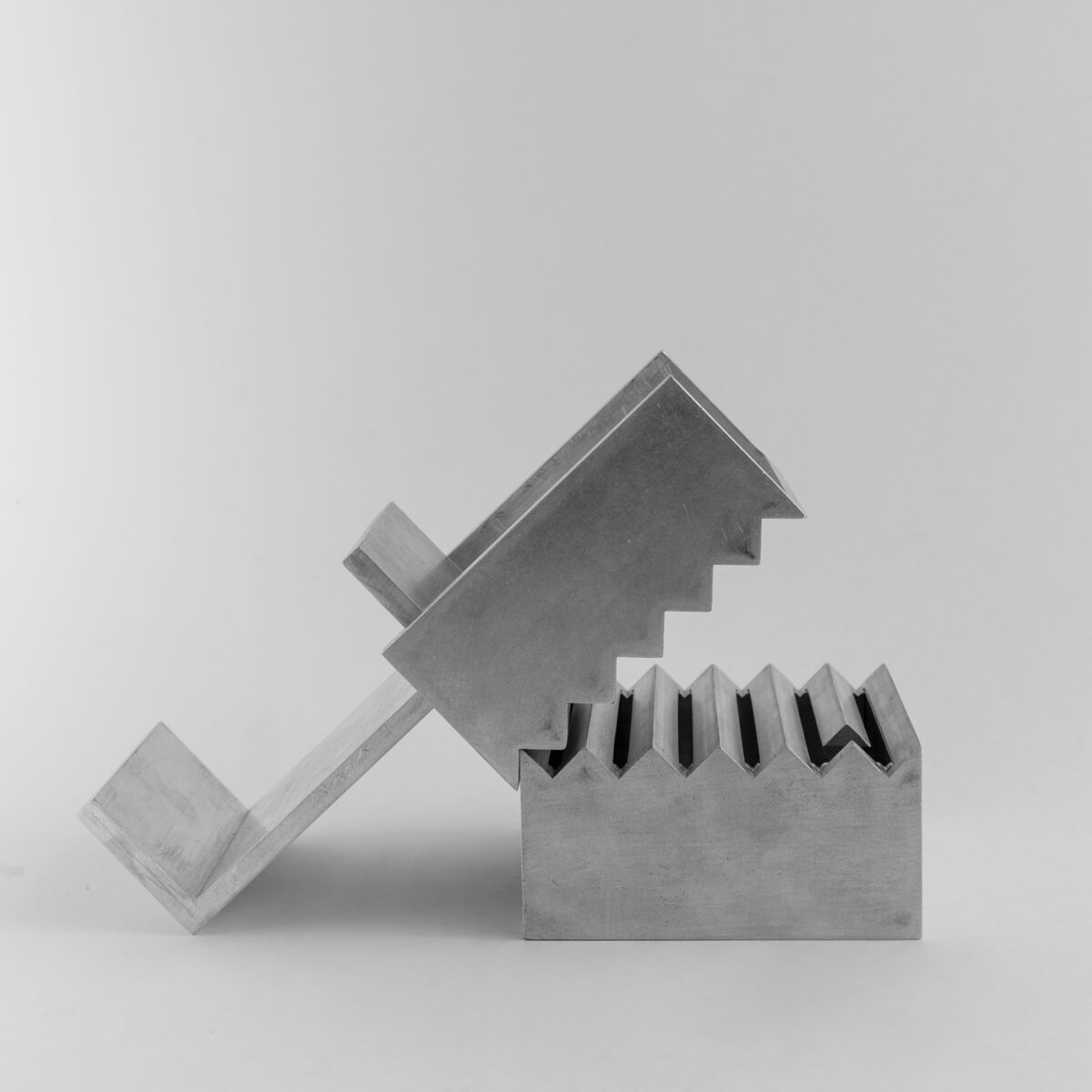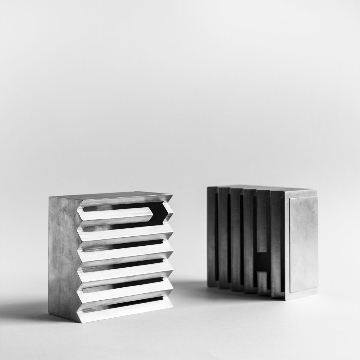 An interplay between form and function inspired this ashtray. Extruded aluminum, with its inherent industrial vocabulary, is minimally reformed. A machined V-form creates an unexpected, almost architectural aesthetic. The resulting halves interlock through friction alone – a testament to aluminum’s precision and expressive potential.