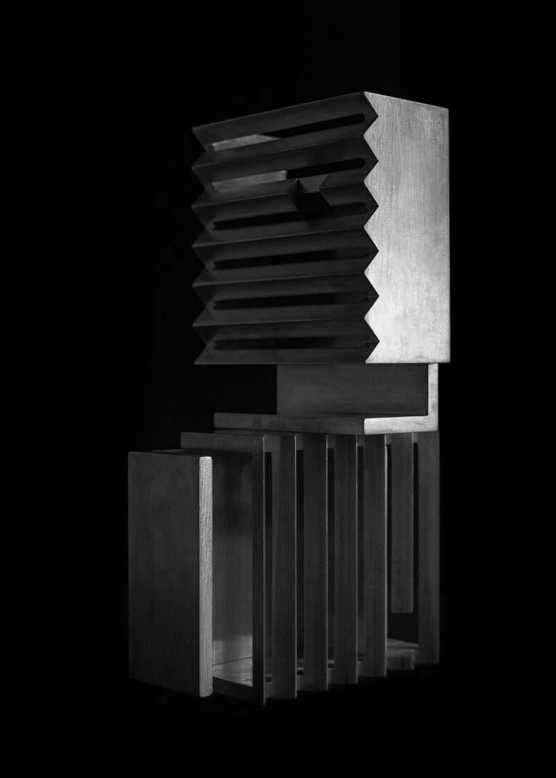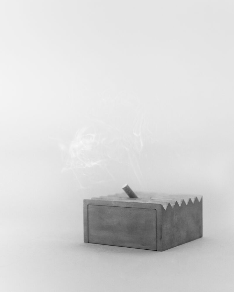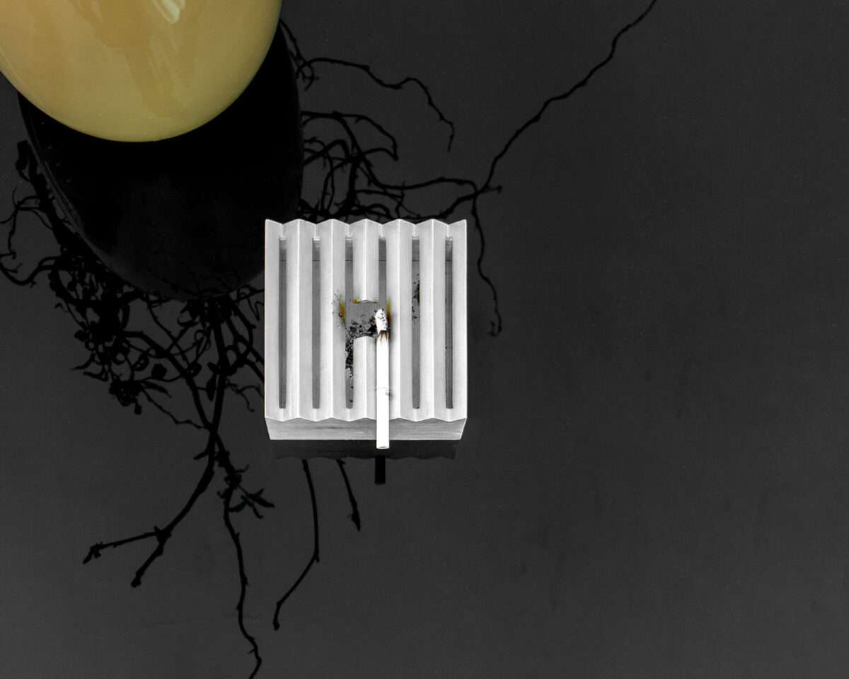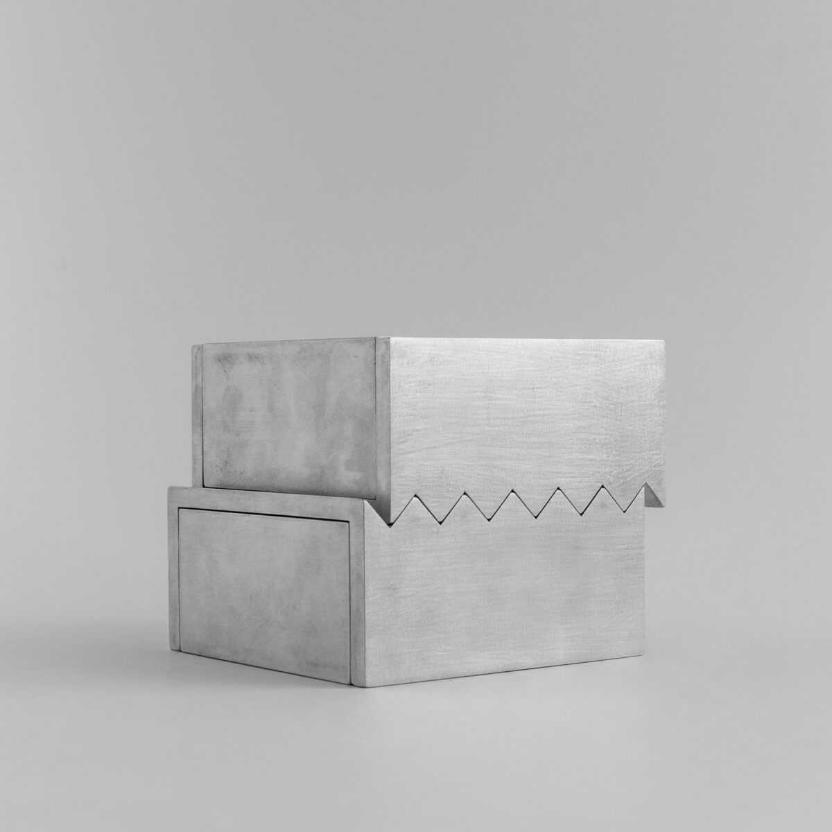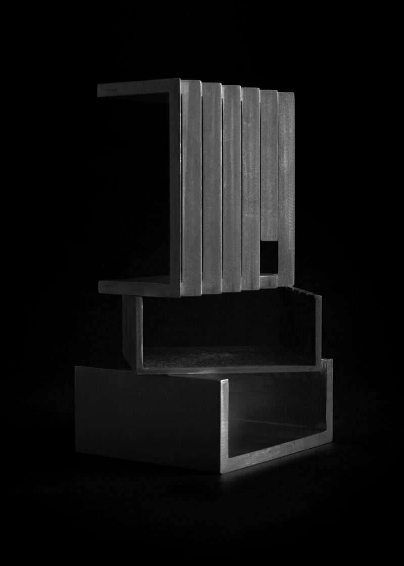 An interplay between form and function inspired this ashtray. Extruded aluminum, with its inherent industrial vocabulary, is minimally reformed. A machined V-form creates an unexpected, almost architectural aesthetic. The resulting halves interlock through friction alone – a testament to aluminum’s precision and expressive potential.