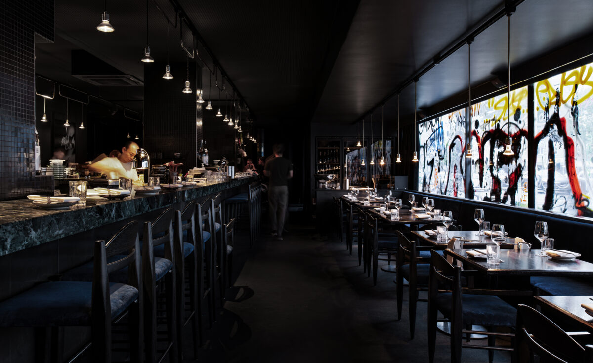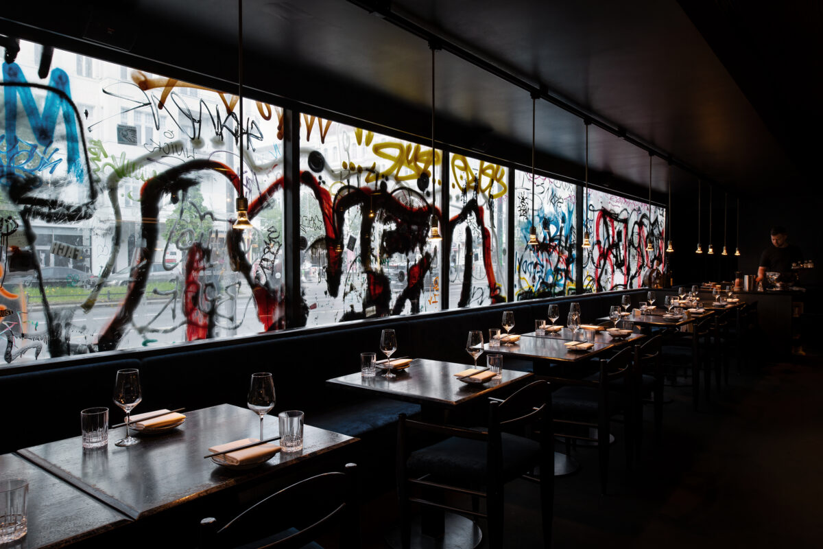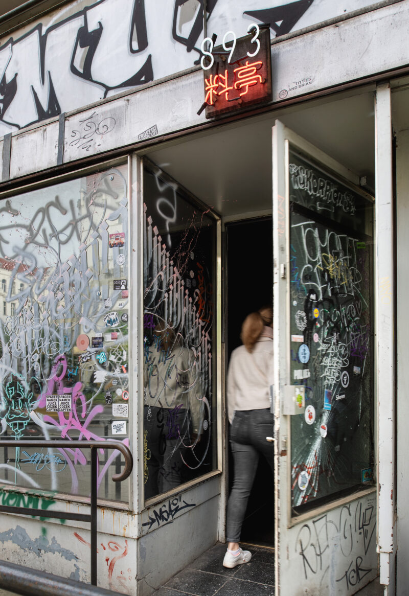 893 Ryotei occupies the storefront interior space of a 1960s Hans-Dieter Bolle structure – a former locus of the banal, a “Schlecker” drugstore. Its graffiti-scarred facade reflects a radical transformation – it is essentially tattooed. Mirrored surfaces create a disorienting interplay with the urban fabric.