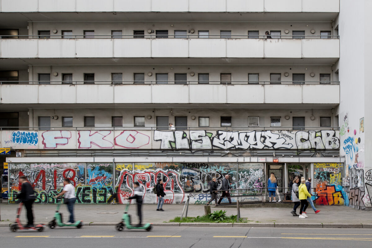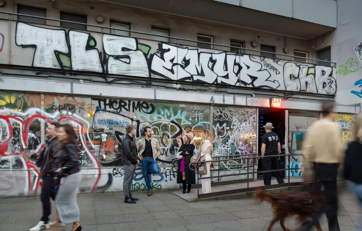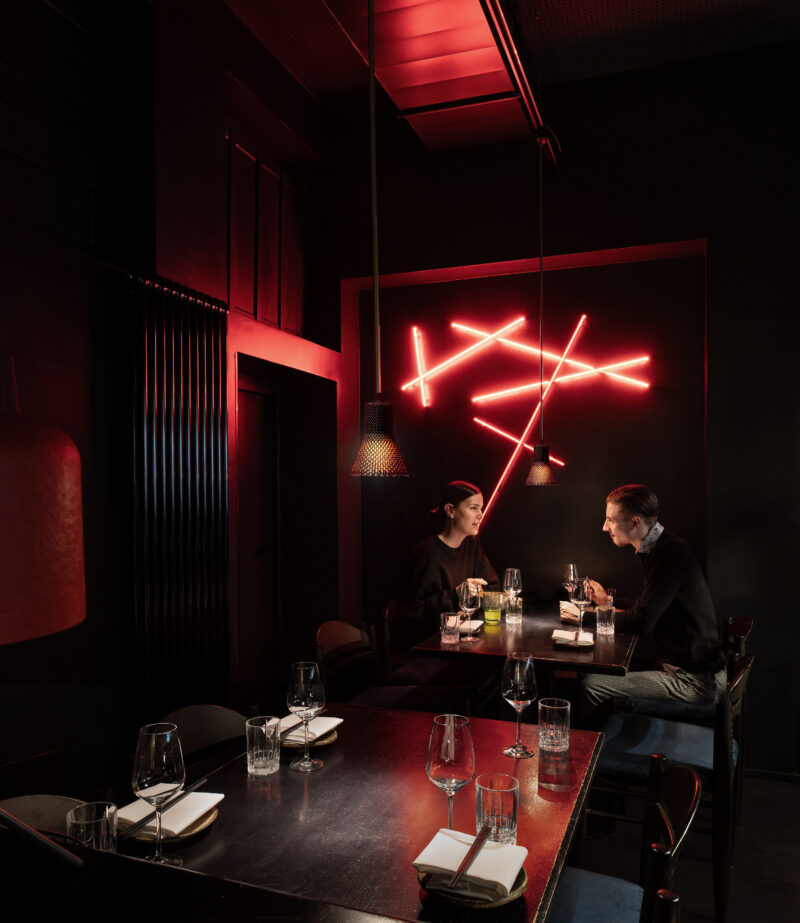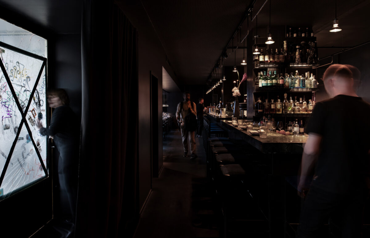 893 Ryotei occupies the storefront interior space of a 1960s Hans-Dieter Bolle structure – a former locus of the banal, a “Schlecker” drugstore. Its graffiti-scarred facade reflects a radical transformation – it is essentially tattooed. Mirrored surfaces create a disorienting interplay with the urban fabric.