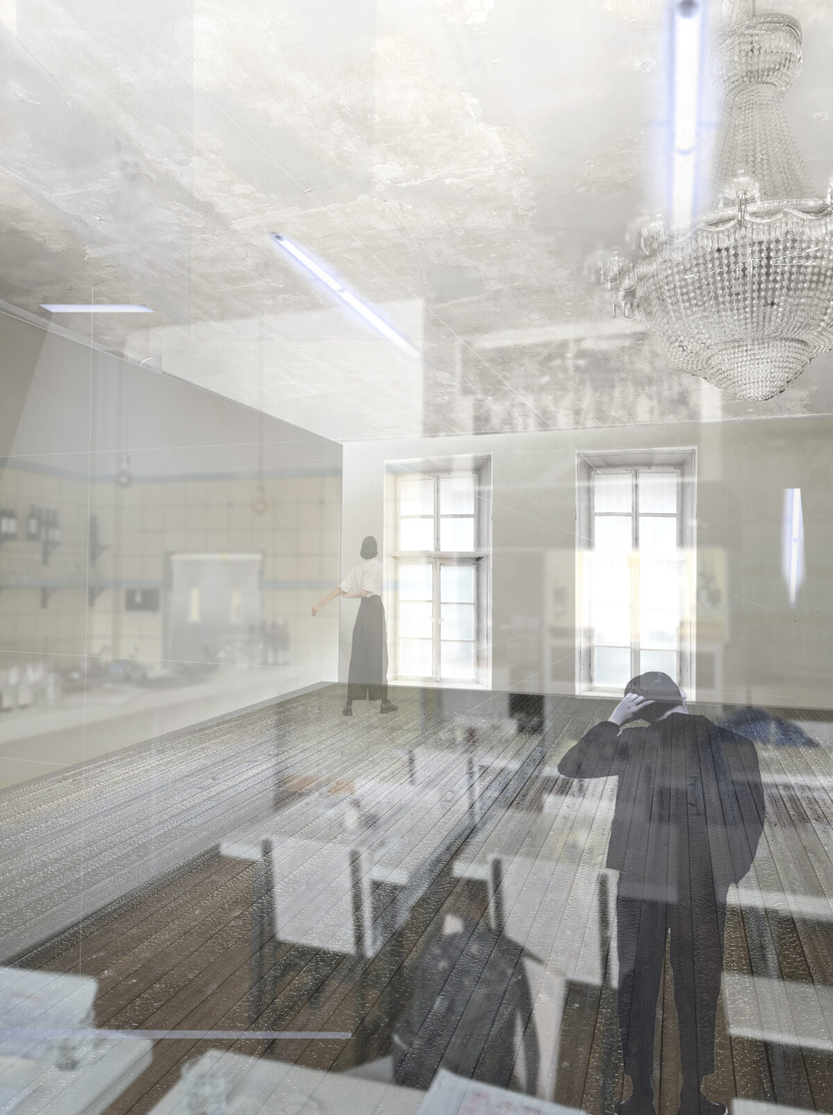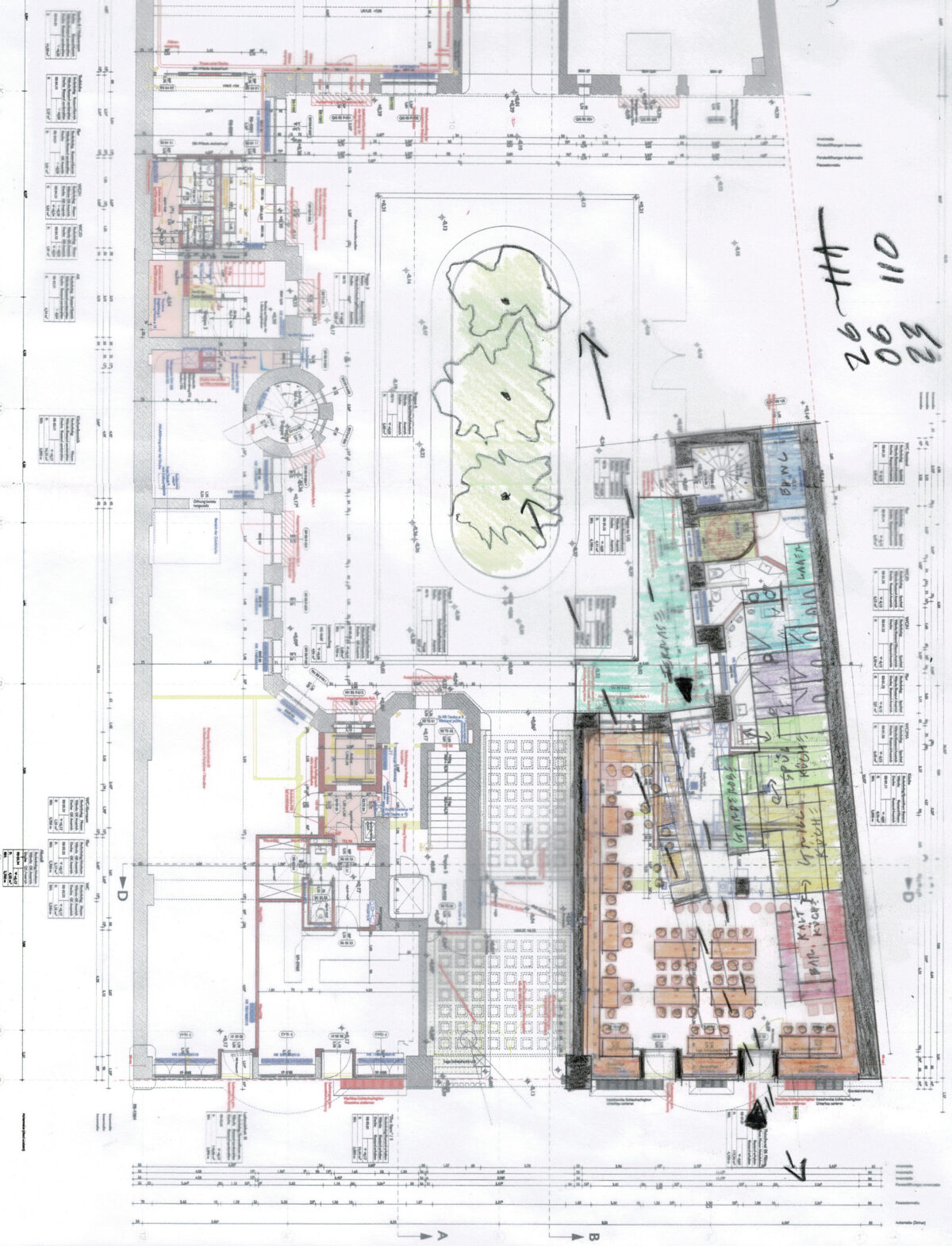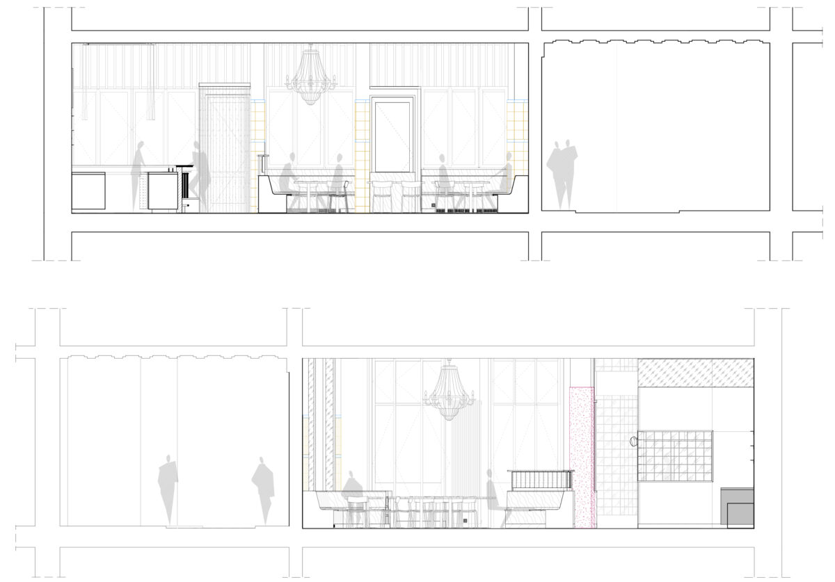 The key move is a lateral inversion: bar, kitchen, and bathrooms shift from left to right. This frees the courtyard façade, brings daylight back to the ≈4 m high dining room, and clarifies circulation between street and courtyard.