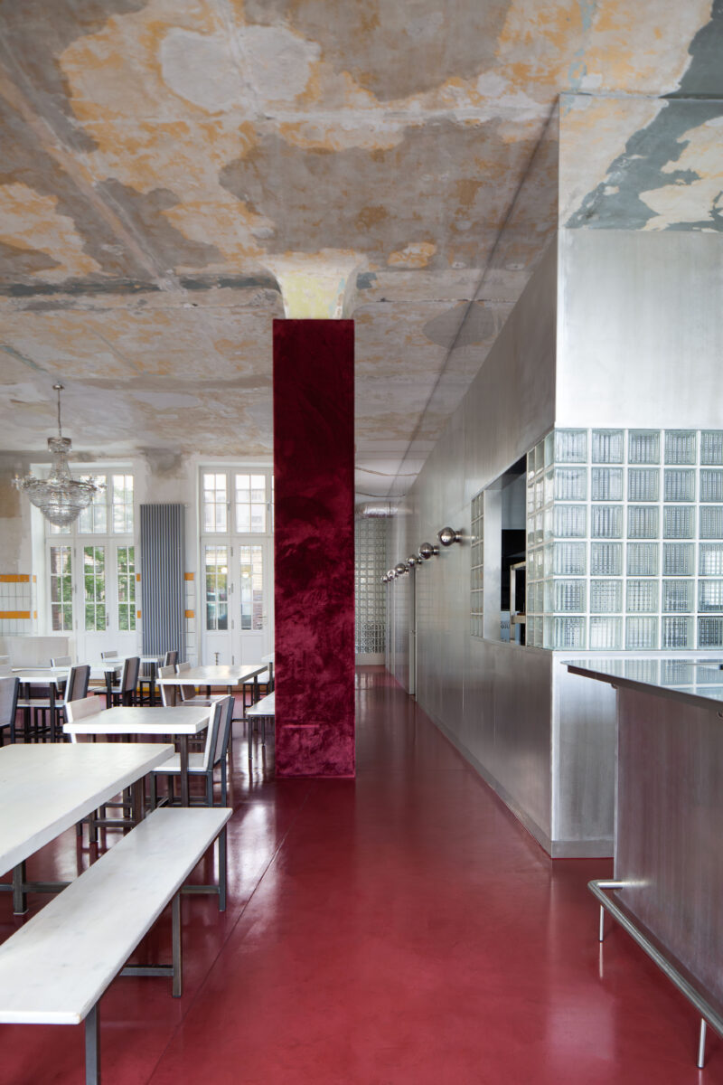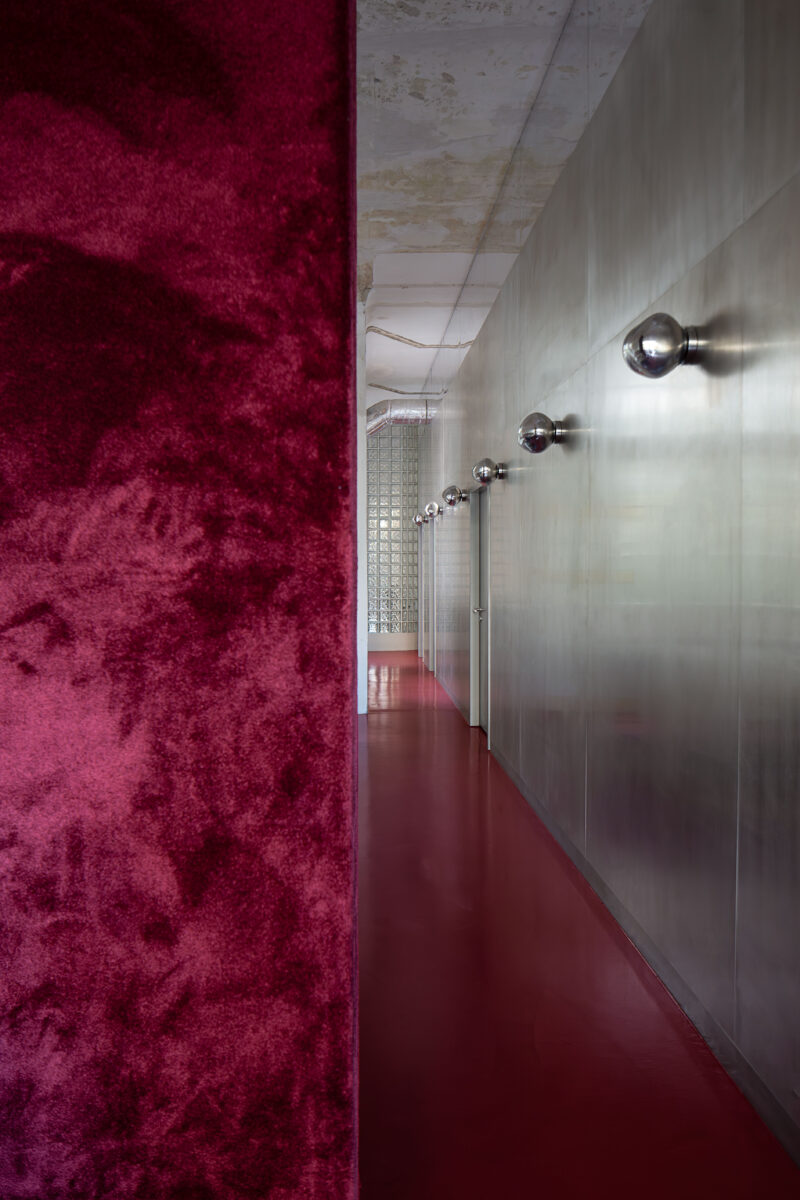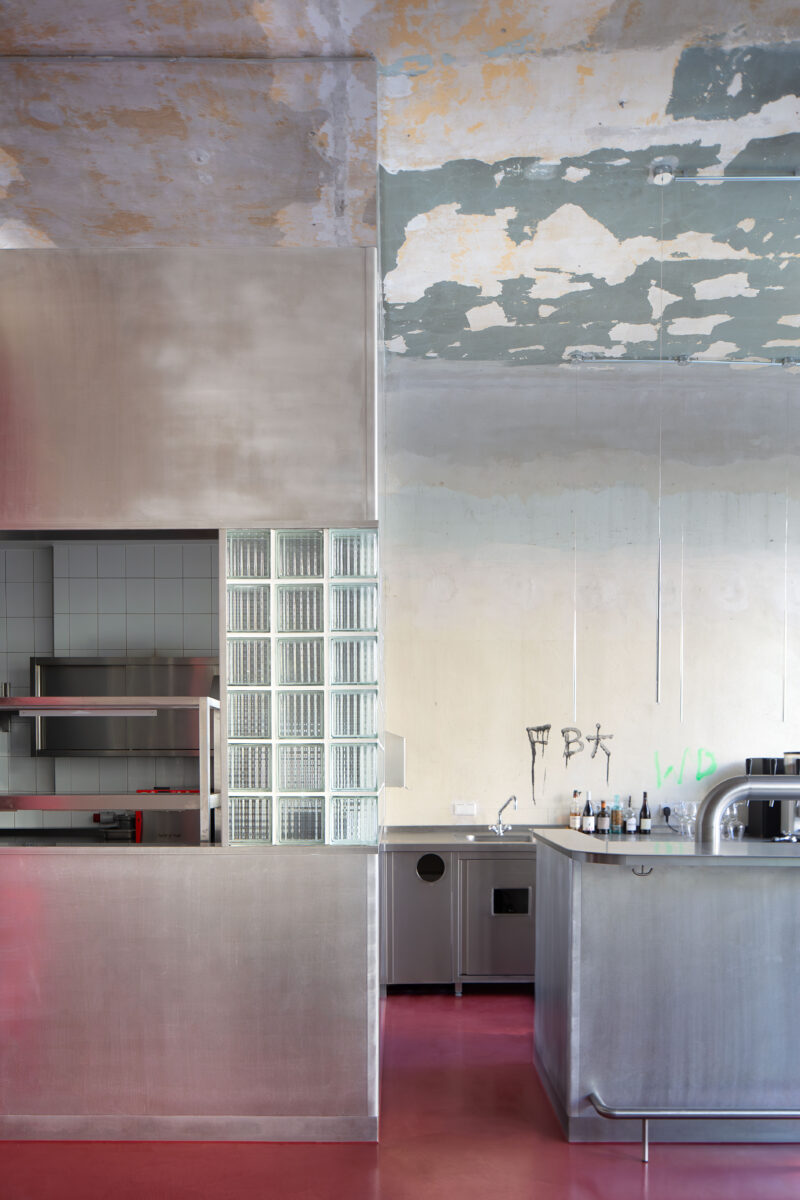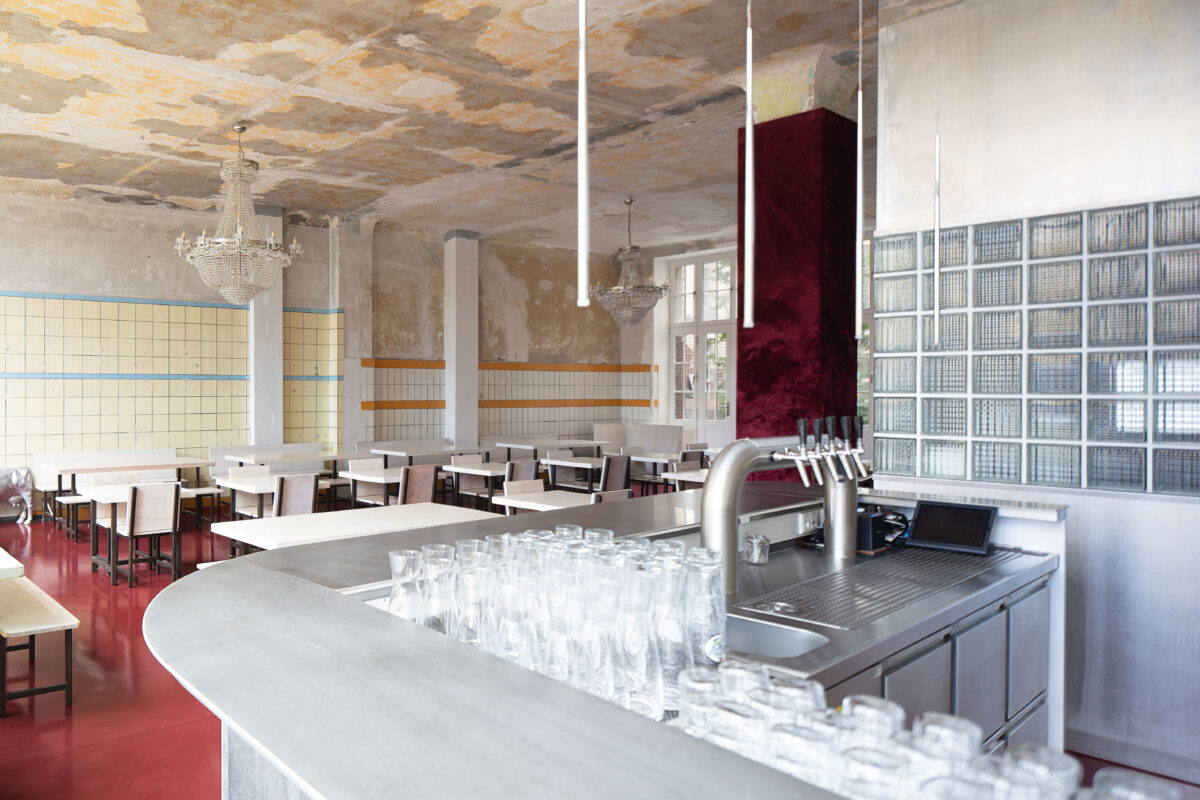 Existing substance (colored tiles, varied plasters, raw ceilings) was retained and sealed; replica tiles continue the language where new walls appear. A poured blood-red floor and a red-carpet-clad column anchor the room, while hand-worked stainless steel and aluminium form counters and cladding. A curved beech bench, soft new curtains, glass-block inserts, and a curved stainless bar complete the set. Outside, the blue Fleischerei neon remains.