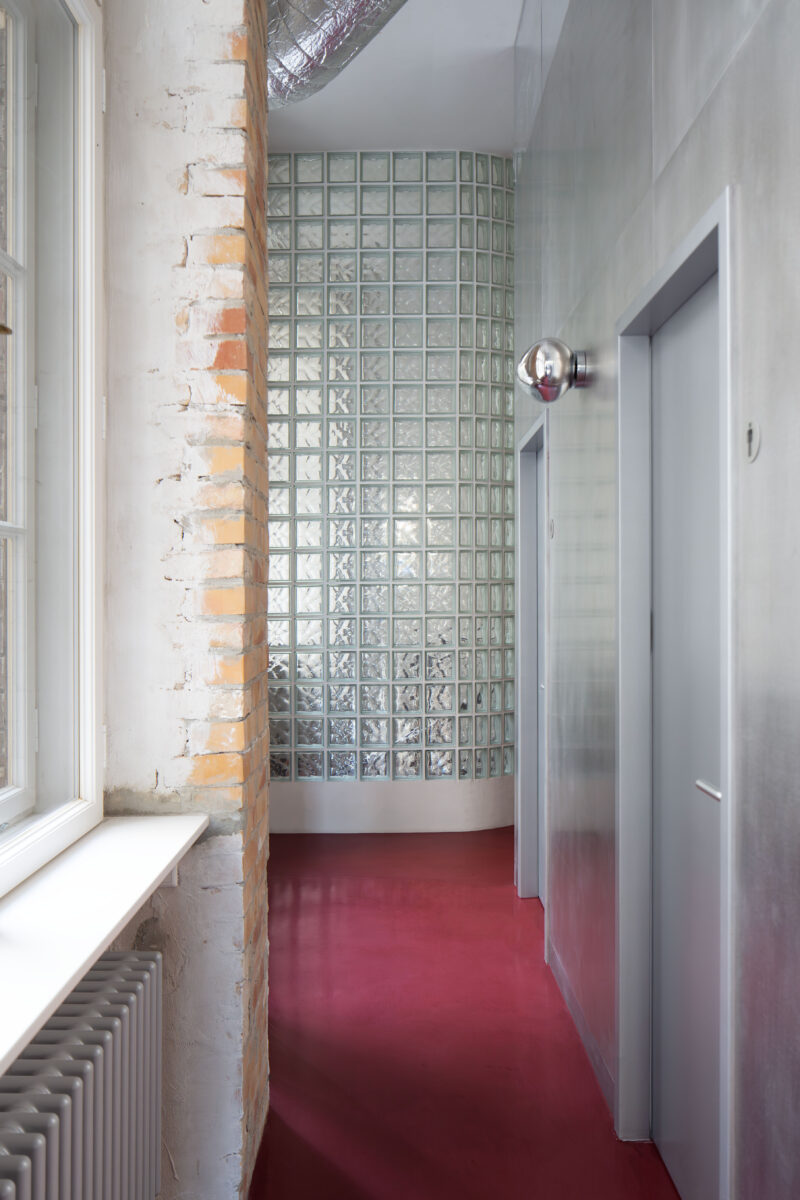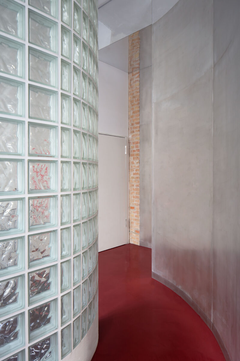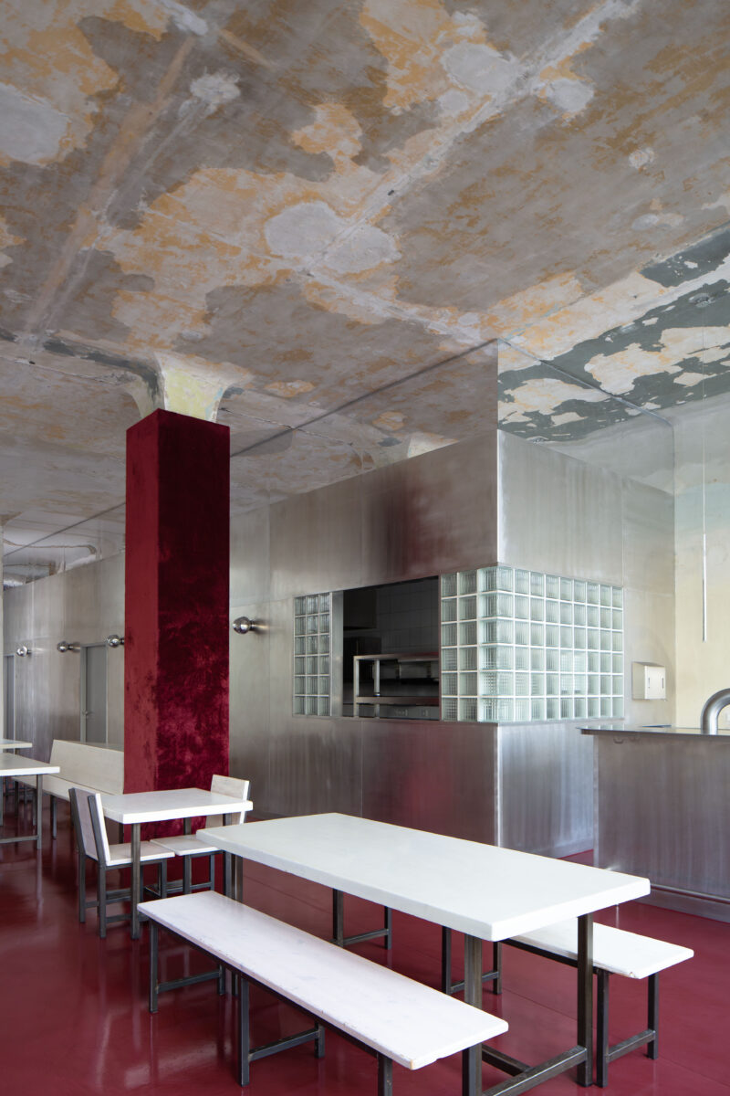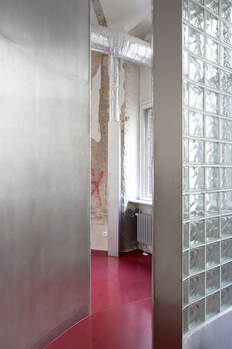 Existing substance (colored tiles, varied plasters, raw ceilings) was retained and sealed; replica tiles continue the language where new walls appear. A poured blood-red floor and a red-carpet-clad column anchor the room, while hand-worked stainless steel and aluminium form counters and cladding. A curved beech bench, soft new curtains, glass-block inserts, and a curved stainless bar complete the set. Outside, the blue Fleischerei neon remains.
