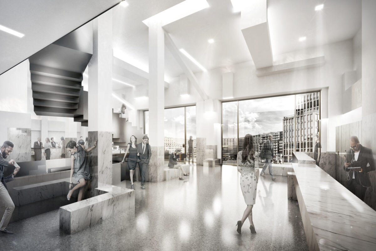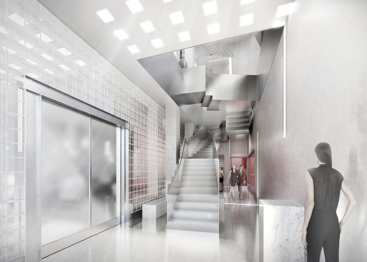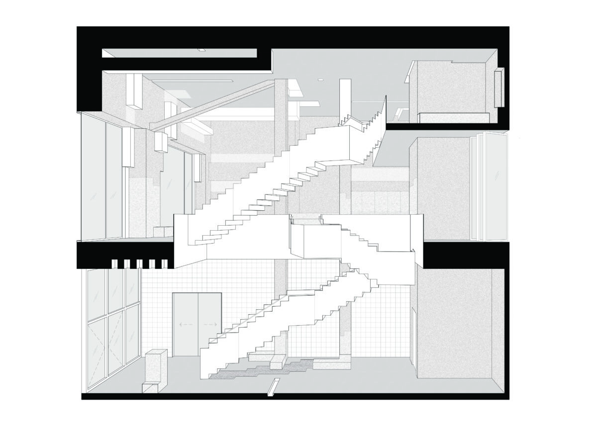 This unrealized proposal for the Vodafone building on Leipzigerplatz 14 investigates the transformative potential of a found condition. The existing fireproofing material – a fortuitous composition of gypsum board – is reframed as a raw canvas for material exploration. A network of interconnected yet disjunctive angular stairs navigates the vertical space, their form echoing the distorted surfaces overhead. This interplay between the meandering stairs and the amplified ceiling texture erodes the distinction between interior and exterior, transforming the ceiling into a dynamic element that interacts with the urban context. The accidental becomes intentional, the overlooked becomes a field for architectural investigation.