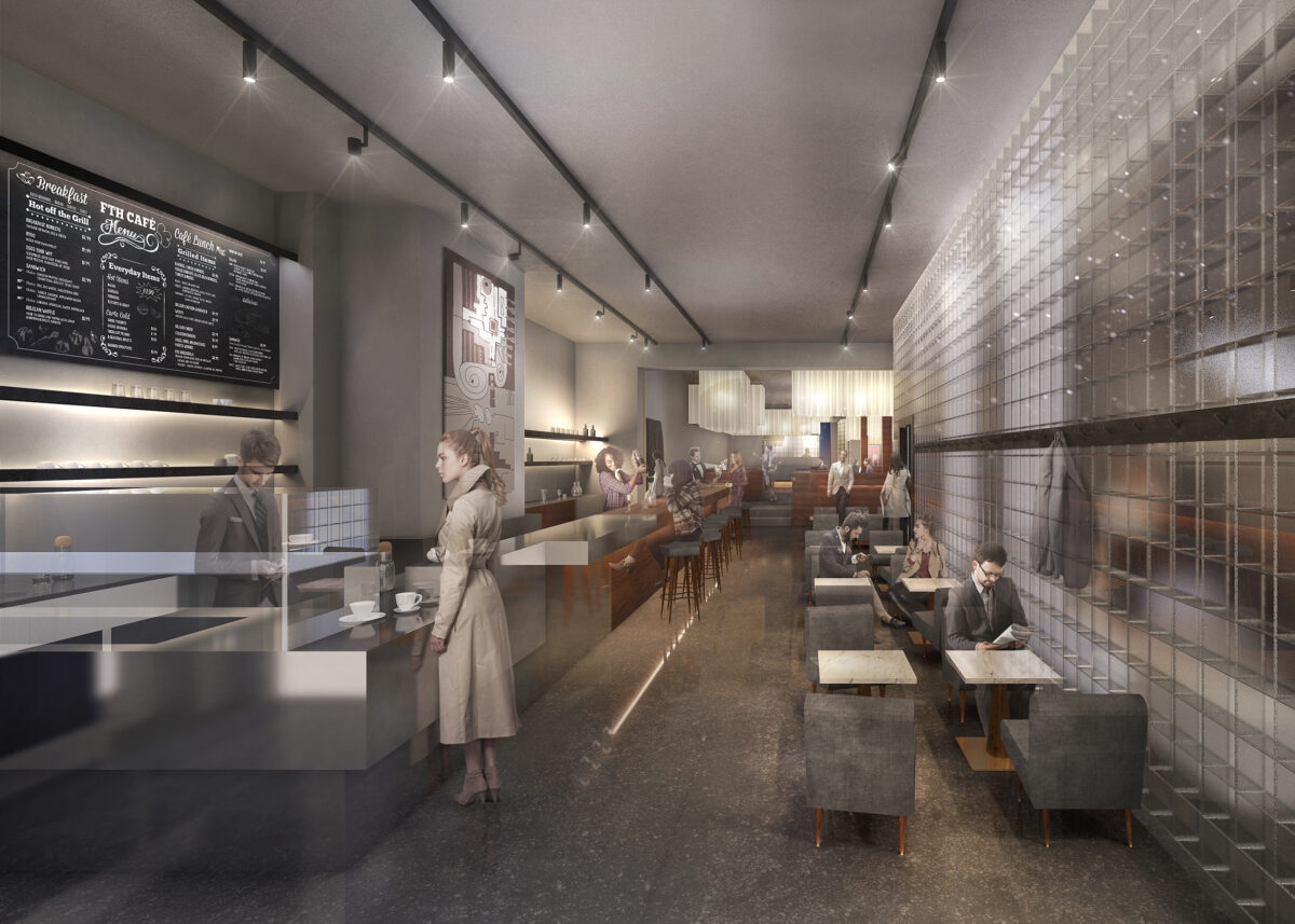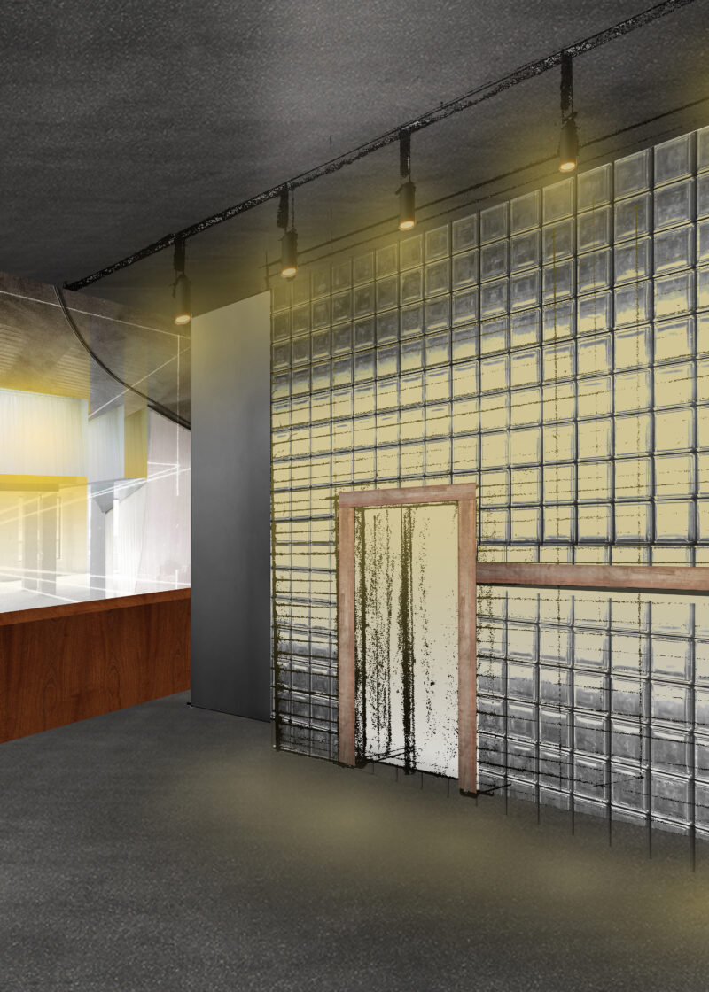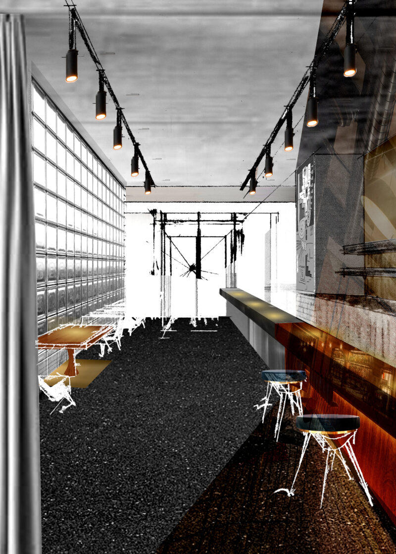 The long bar and adaptable seating, strategically placed beside the full-glass facade, offer a versatile and vibrant atmosphere. The glass blocks, recurring along the stairwell, visually connect this space to the event area above, infusing both with softened light. The addition of draped fabric above designated areas adds indirect lighting, creating intimate corridors within the open plan, further enhancing the adaptability and vibrancy of this space.