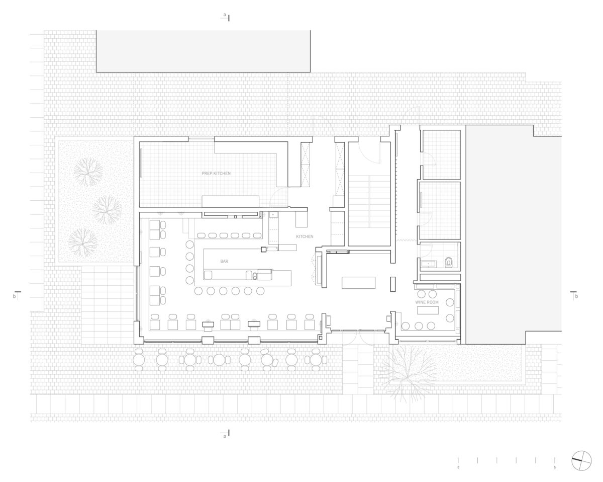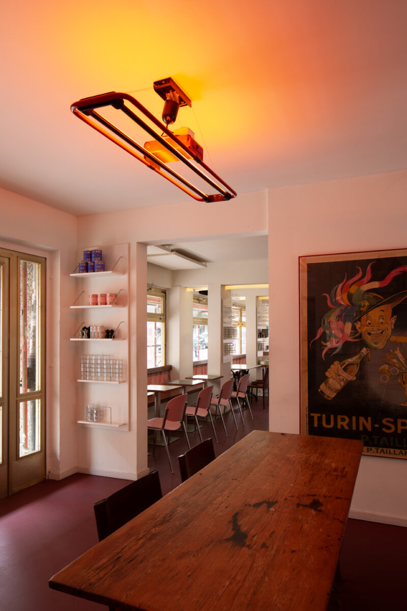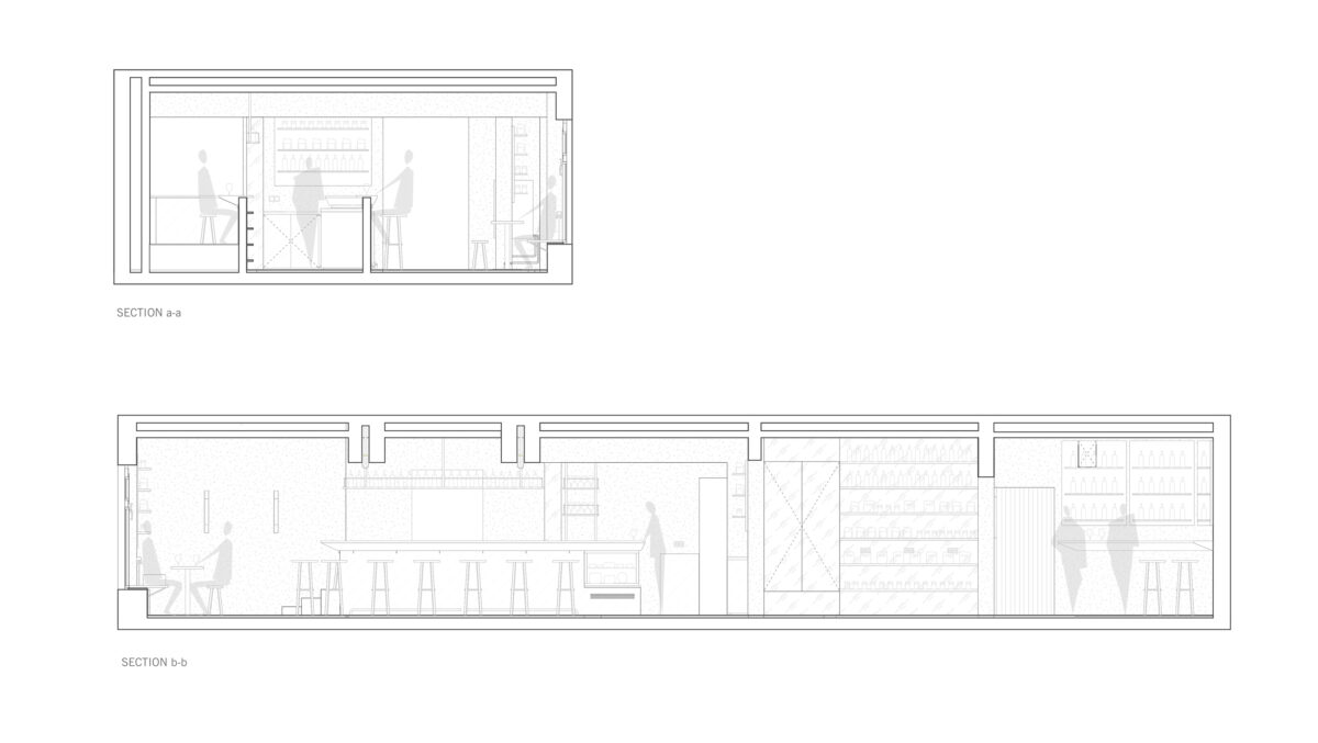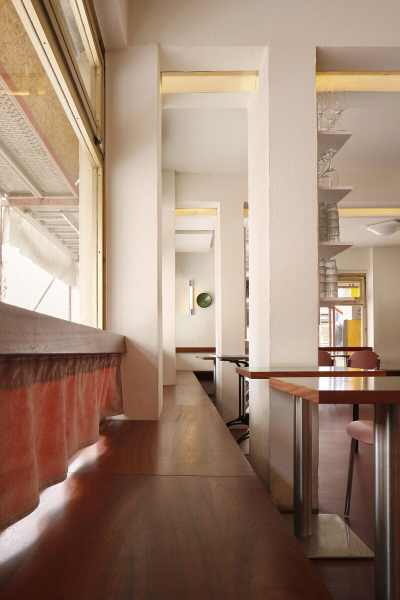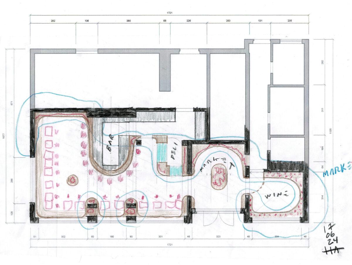 An understated façade conceals the activity inside. Entry is through a foyer with a bookshop sensibility, where cured meats, fruit, and Italian wines are displayed with precision. This central space links a focused wine-tasting room on one side and a lively market on the other.