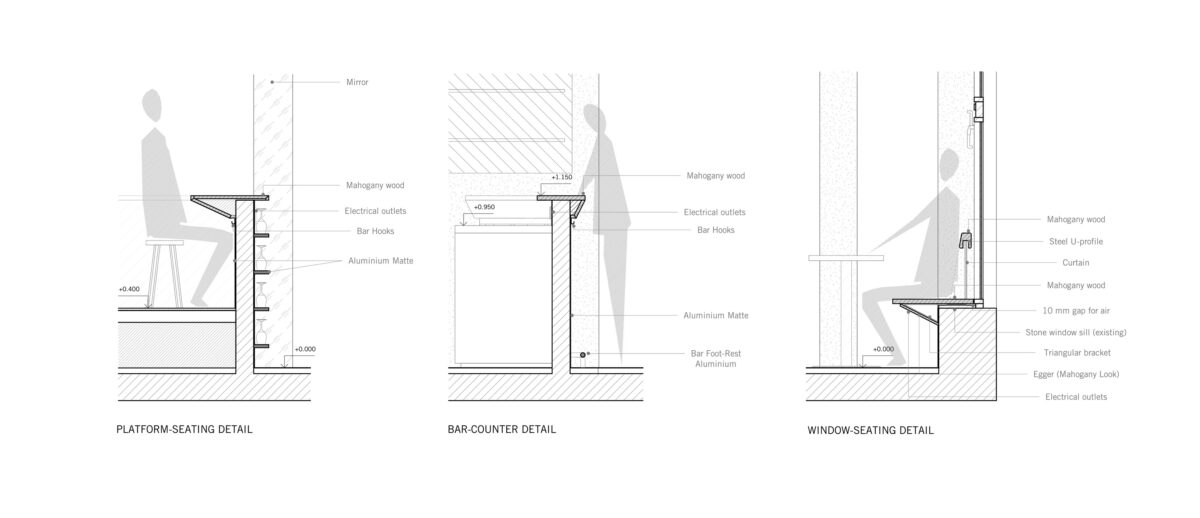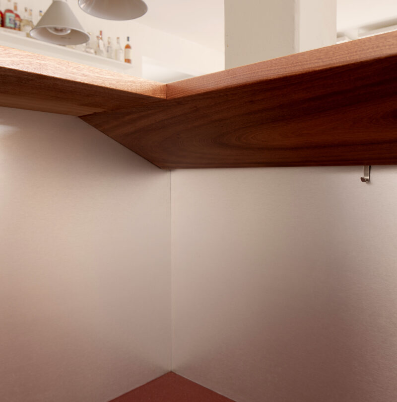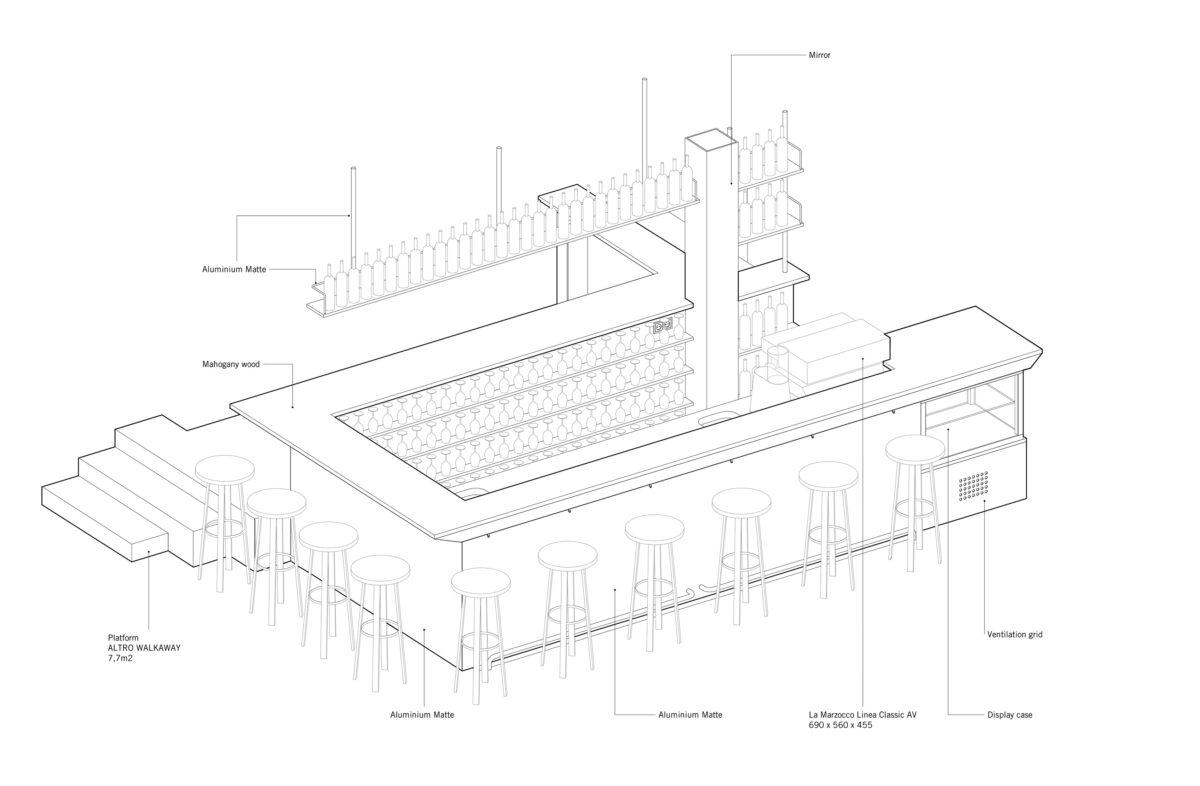 In the market, contrasts set the tone. U-Bahn-inspired flooring anchors the room; mahogany seating and bar add warmth. Stainless-steel work surfaces and minimalist shelving frame the color of Italian produce and delicacies.
